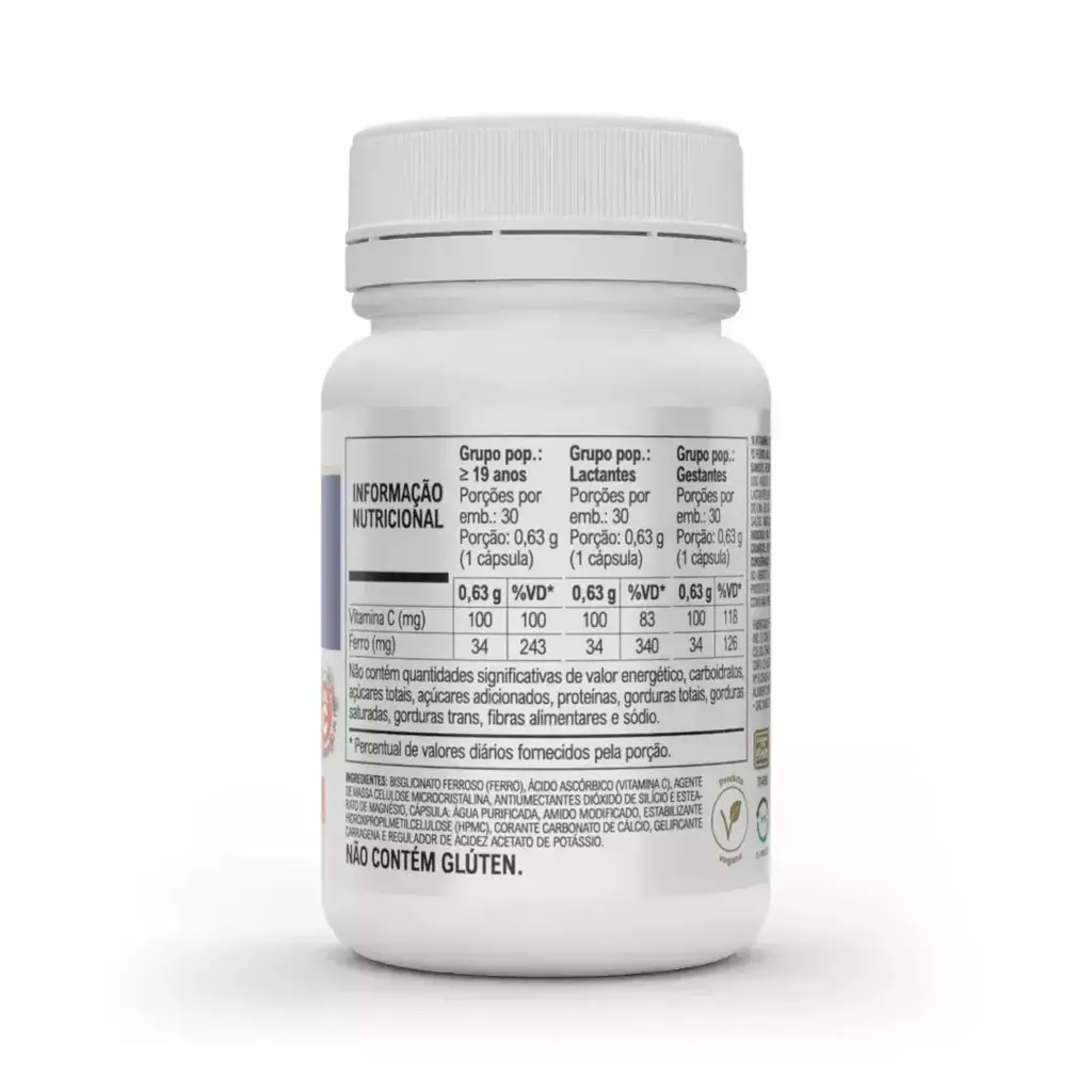 Bisglicinato ferroso (ferro), ácido ascórbico (vitamina C), agente de massa celulose microcristalina, antiumectantes dióxido de silício e estearato de magnésio, cápsula: água purificada, amido modificado, estabilizante hidroxipropilmetilcelulose (HPMC), corante carbonato de cálcio, gelificante carragena e regulador de acidez acetato de potássio.