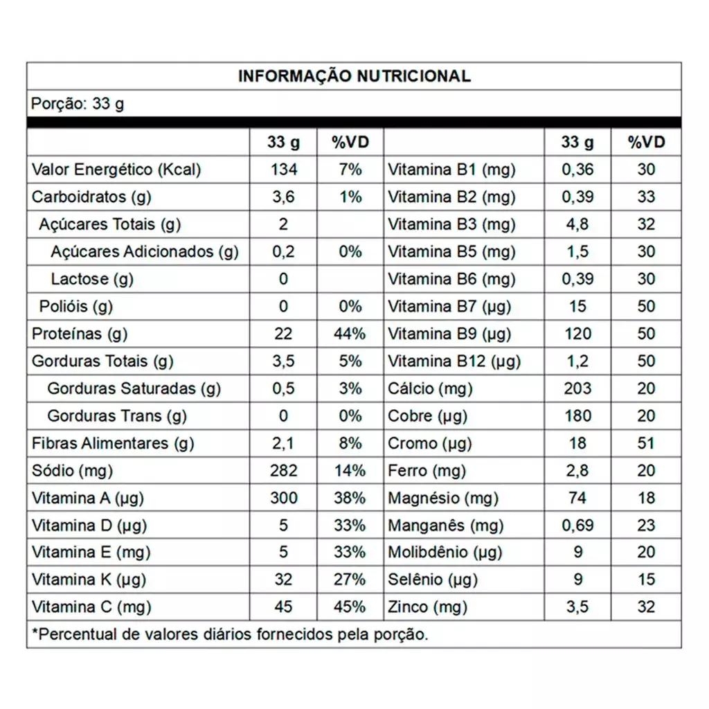 Proteína isolada da ervilha, proteína da amêndoa, polpa de banana liofilizada, blend de vitaminas e minerais (bisglicinato de cálcio, bisglicinato de magnésio, ácido ascórbico revestido, betacaroteno, mix de tocoferóis, bisglicinato de ferro, bisglicinato de zinco, nicotinamida, bisglicinato de manganês, colecalciferol vegano, menaquinona-7, fitomenadiona, pantotenato de cálcio, acetato de retinol, L-selenometionina, bisglicinato de cobre, cloridrato de tiamina, riboflavina-5-fosfato, piridoxal-5-fosfato, picolinato de cromo, L-metilfolato de cálcio, ácido fólico, molibdato de sódio, biotina, metilcobalamina), canela em pó (Cinnamomum cassia), inulina, aroma natural, aroma natural extrato de canela, espessante goma gelana, edulcorante glicosídeos de esteviol (estévia), antiumectante dióxido de silício